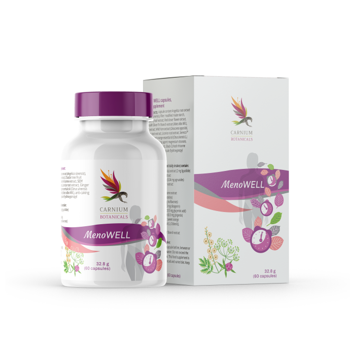 A MenoWELL egy természetes étrend-kiegészítő, amelyet kifejezetten a nők támogatására terveztek a menopauza és a klimax (az átmeneti időszak, amikor a szervezet termékenyből terméketlenbe alakul át) alatt. Ebben az időszakban a nők különböző hormonális változásokat tapasztalhatnak, amelyek hatással vannak a jólétükre. A MenoWELL gondosan válogatott természetes kivonatokat kombinál, hogy segítsen enyhíteni a menopauzás tüneteket és támogassa az általános fizikai és mentális jólétet. A barátcserje (Vitex agnus-castus) segít fenntartani a hormonális egyensúlyt, és enyhíti az olyan tüneteket, mint a hőhullámok, hangulatingadozás és ingerlékenység. Hozzájárul a test és a szellem regenerálódásához is, ami javítja a nők fizikai és pszichológiai jólétét az érzékeny menopauzás időszakban. A fürtös poloskavész támogatja a nyugodt és kényelmes átmenetet a menopauzába. Enyhíti az olyan kellemetlen tüneteket, mint az izzadás, a nyugtalanság és az ingerlékenység, és hozzájárul az általános komfortérzethez. A természetes izoflavonokban gazdag fekete lóhere (Trifolium pratense) támogatja a szív- és érrendszer egészségét. Erősíti az erek rugalmasságát, javítja a szívműködést és segít szabályozni a vérnyomást, ami különösen fontos a menopauzában lévő nők számára.